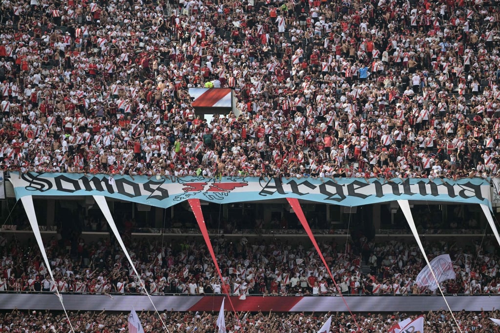 Знаме с надпис „Ние сме Аржентина“ и карта на Фолкландските острови е изложено преди футболен мач в Буенос Айрес на 19 април. Снимка: AFP