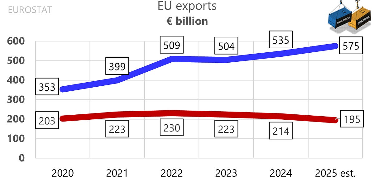 През 2025 г. износът на ЕС за Китай се очаква да бъде с 44% под износа за Обединеното кралство и с повече от 10% под износа за Швейцария. През последните пет години разликата в износа в полза на САЩ се е увеличила с 230 милиарда евро.
