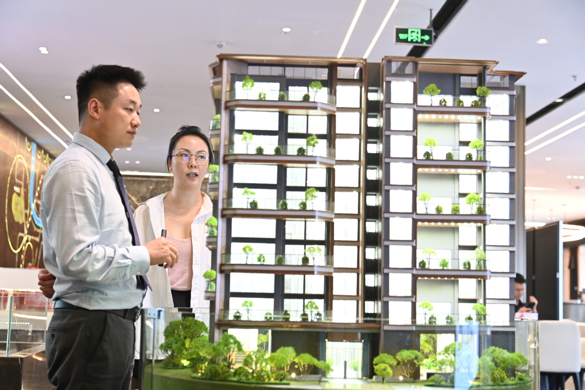 Служител (вляво) говори за проект за недвижими имоти в процес на изграждане на посетител в Чунцин на 16 септември. SUN KAIFANG/ЗА КИТАЙ ДАЙЛИ