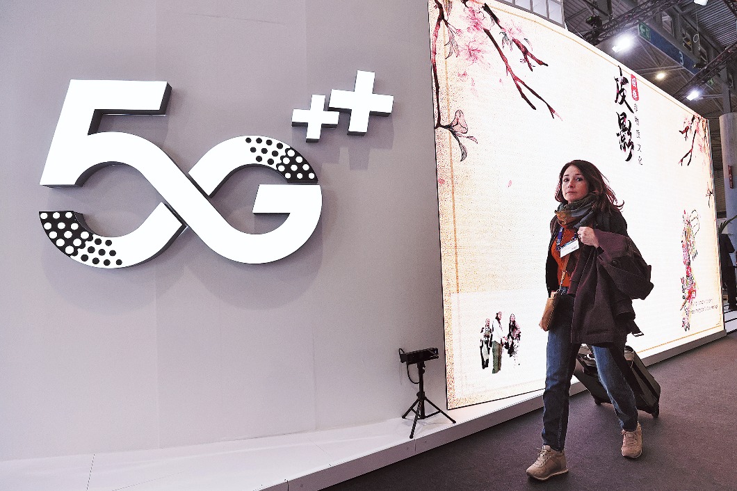 Посетител минава покрай щанда на China Mobile по време на Световния мобилен конгрес в Барселона, Испания, през февруари 2024 г. GAO JING/XINHUA