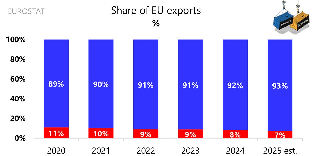 Устойчивостта на износа на ЕС досега през това десетилетие е забележителна, като се има предвид стратегията на Китай, насочена навътре, и почти изчезването на Русия от експортната карта на ЕС.