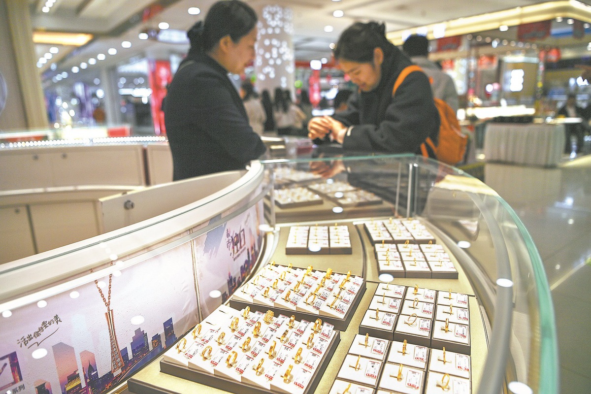 Купувач пробва златни бижута в магазин във Вейфан, провинция Шандонг, на 15 март. WANG JILIN/ЗА КИТАЙ ДАЙЛИ