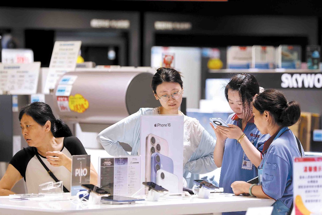 Клиенти разглеждат смартфони с държавни субсидии в търговски център в Jiaxing, провинция Zhejiang, на 27 юни. JIN PENG/ЗА КИТАЙ ДАЙЛИ