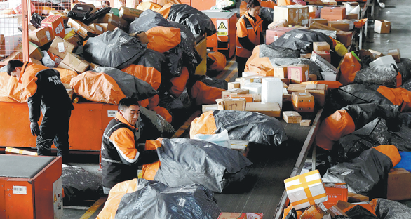 Служители сортират колети в трансферен център за експресна доставка в квартал Luancheng на Shijiazhuang, провинция Hebei, на 28 януари. Li Mingfa/For China Daily