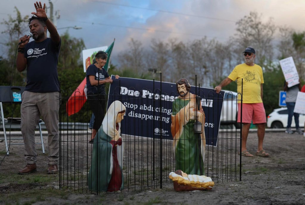 Сцена на Рождество Христово, изобразяваща раждането на Исус Христос, включваща Мария и Йосиф в клетки, докато са държани в ареста, седи близо до входа на „Алигатор Алкатраз“ в Очопи, Флорида, на 21 декември. Снимка: AFPСцена на Рождество Христово, изобразяваща раждането на Исус Христос, включваща Мария и Йосиф в клетки, докато са държани в ареста, седи близо до входа на „Алигатор Алкатраз“ в Очопи, Флорида, на 21 декември. Снимка: AFP