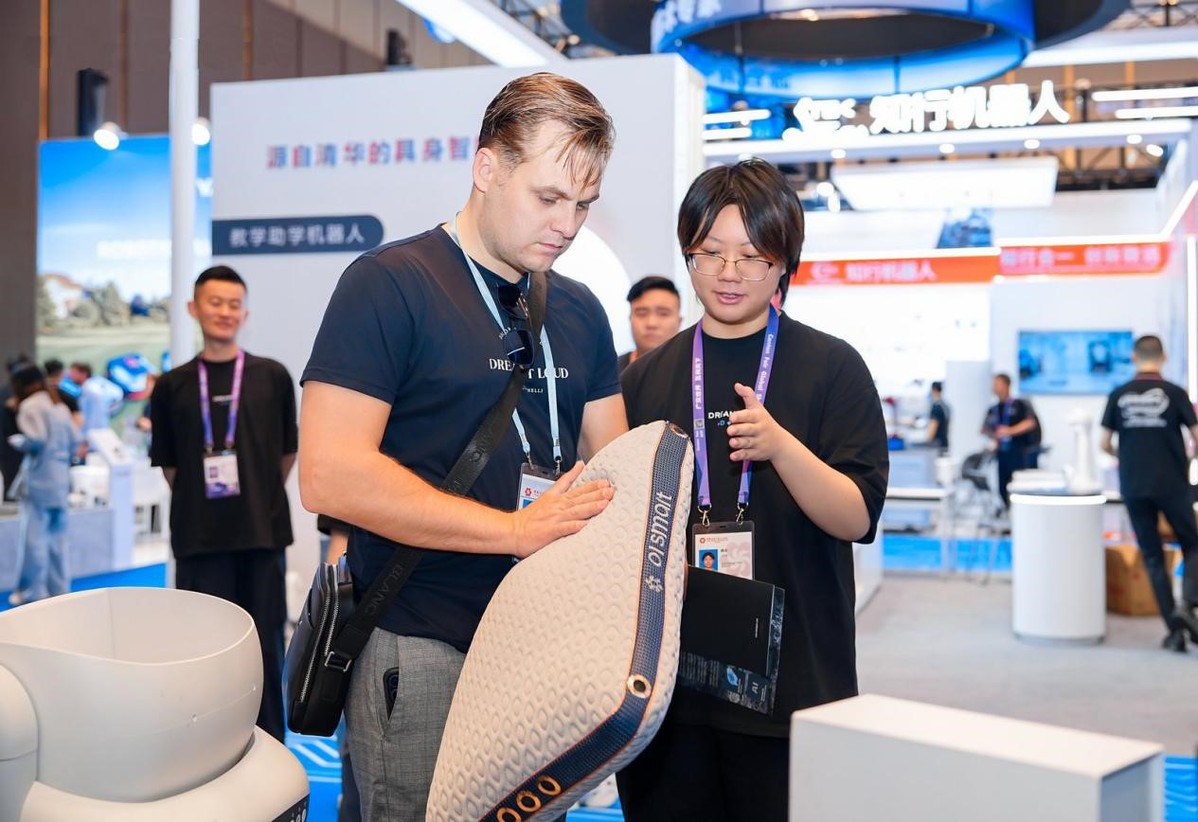 Чуждестранен купувач разглежда интелигентна възглавница за сън, произведена от OI Time Land на 139-ото издание на Китайския панаир за внос и износ в Гуанджоу, провинция Гуангдонг, на 15 април 2026 г. [Photo provided to chinadaily.com.cn]