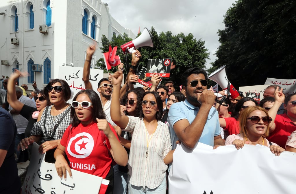Привържениците на Свободната дестарийска партия на Тунис викат лозунги по време на протест срещу тунизийския президент Кайс Саид в Тунис през септември 2024 г. Снимка: EPA-EfeПривържениците на Свободната дестарийска партия на Тунис викат лозунги по време на протест срещу тунизийския президент Кайс Саид в Тунис през септември 2024 г. Снимка: EPA-Efe