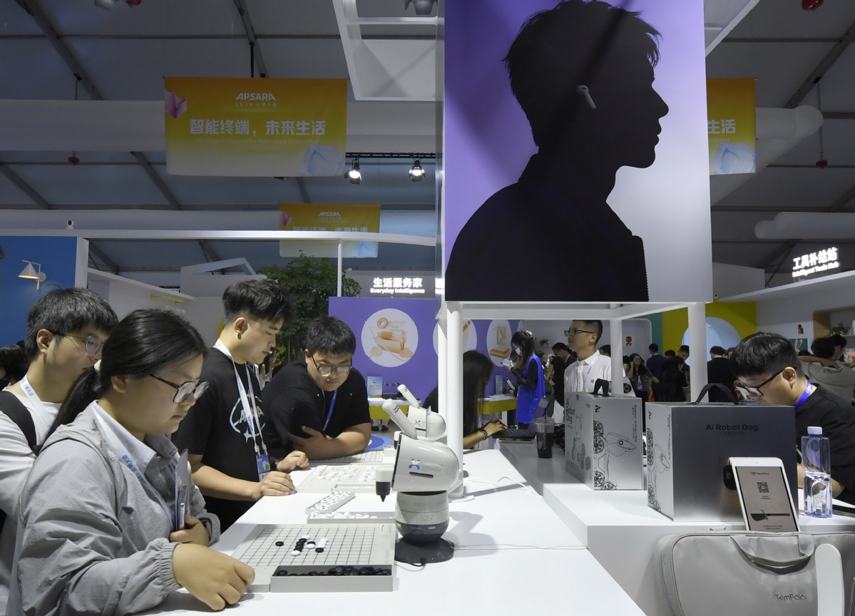 Посетителите играят Five-in-a-Row с интелигентни роботи по време на конференцията Apsara 2025 в Hangzhou, провинция Zhejiang, във вторник. LI ZHONG/ЗА КИТАЙ ДЕЙЛИ