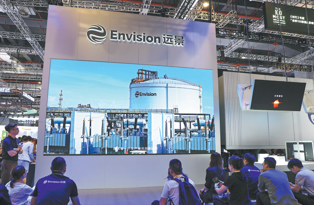 Посетителите гледат въвеждащо видео на изложбения щанд на Envision по време на четвъртото изложение за съхранение на енергия в Китай на EESA в Шанхай на 14 август. CHINA DAILY