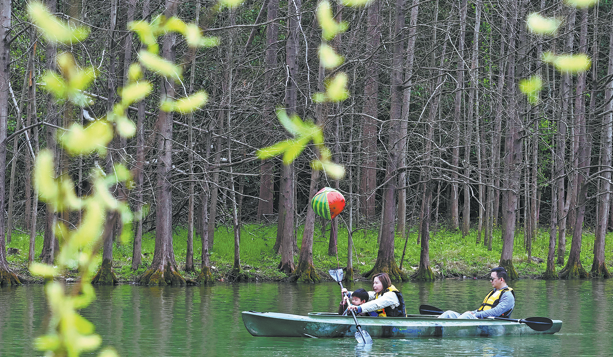 Семейство гребе в Shanghai Century Park в Шанхай на 22 март. CHEN HAOMING/XINHUA